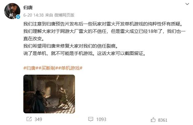不过《归唐》在曝光后,由于当前还缺少比较连贯的实机录制画面,曾有部分玩家质疑游戏在“单机”等标签上的真实性,对此,官方也做了相关回应。