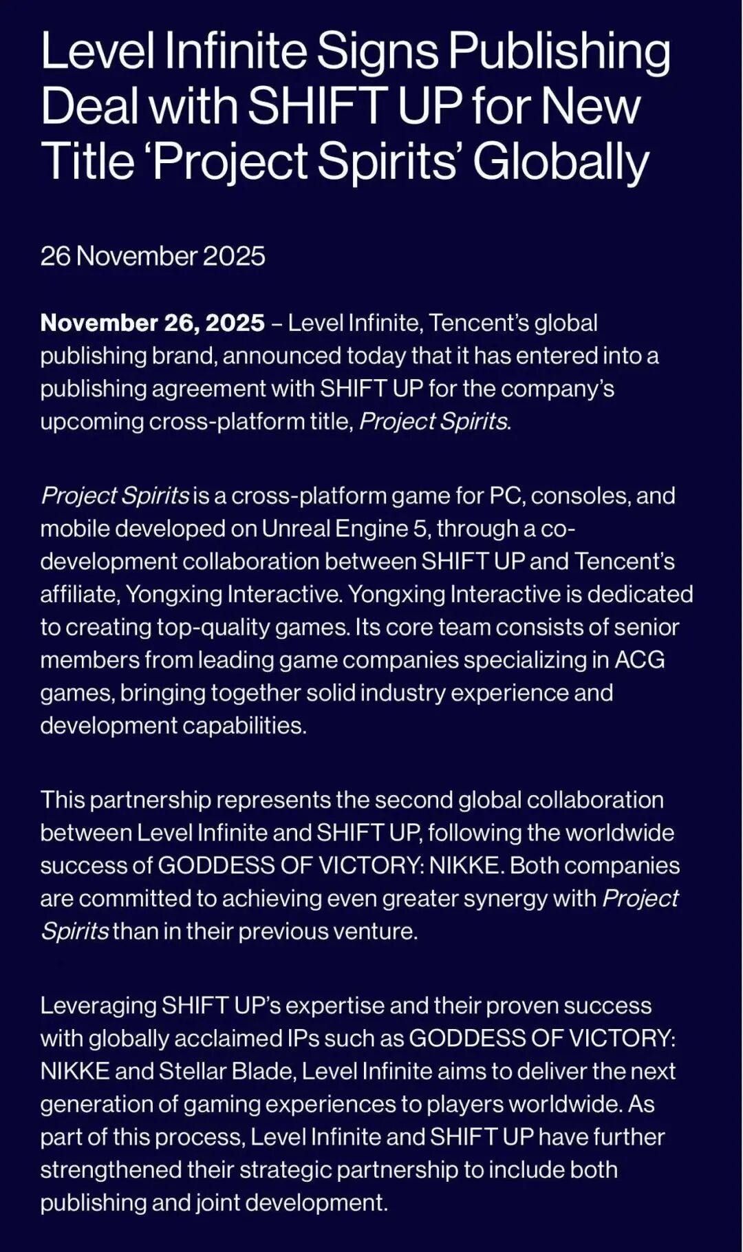 11月26日,腾讯旗下的全球游戏发行品牌Level Infinite宣布,已与韩国游戏开发商SHIFT UP就其即将推出的跨平台游戏《Project Spirits》签署发行协议。