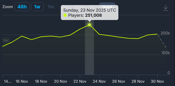 这一结果并不令人惊讶。自11月14日在海外多个平台上线以来,《燕云十六声》受到了海外玩家较为广泛的关注,Steam(国区暂未开放)的最高在线人数首日超过14万,并且表现平稳,在上线一周后突破了25万。