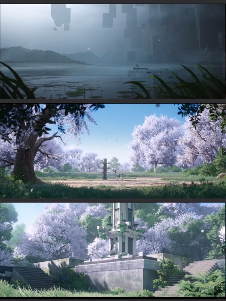 武陵城是一座以“水”为主题的城市,在美学设计上充满东方意境。顺着剧情在竹筏上顺流而下,在水墨一般的景色之间眺望青绿色调的武陵,是一段非常惊艳的视听感受。