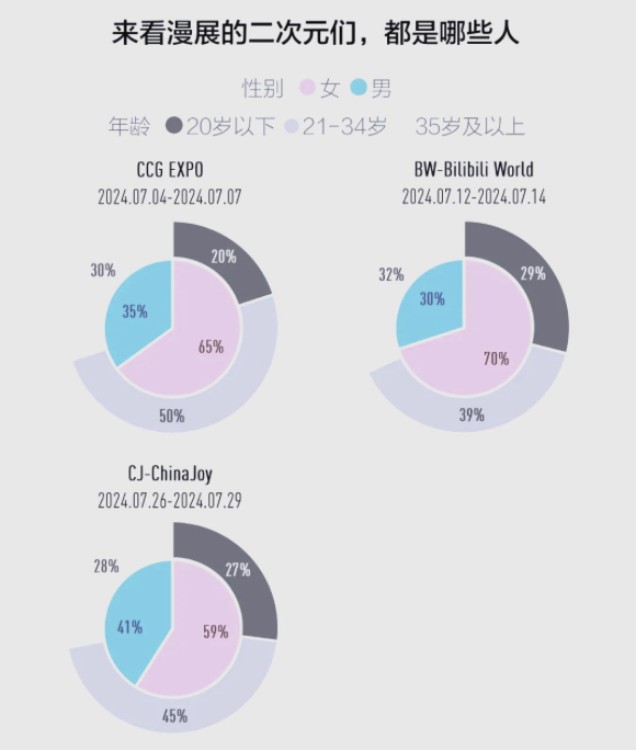 2020 年之后,女性逐渐成为漫展的主要受众,并在各类综合性漫展中占据主力位置。据第一财经报道,2024年BW的游客中,女性占比高达70%。