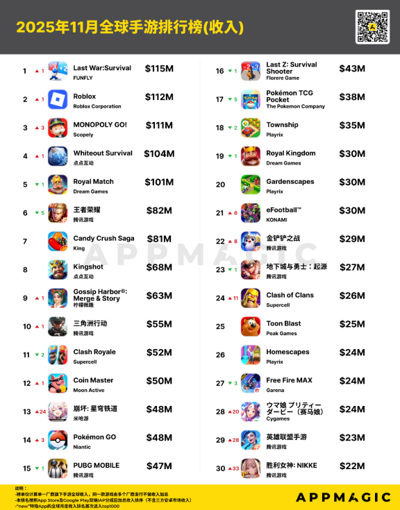 11月收入排行榜显现出明显波动。《Last War:Survival》强势登顶榜首,紧随其后的是《Roblox》《MONOPOLY GO!》。需要注意的是,前五名中仅《无尽冬日(Whiteout Survival)》实现收入增长,其余产品均出现下滑。腾讯旗下《王者荣耀》此次跌出前五,暂居第六。