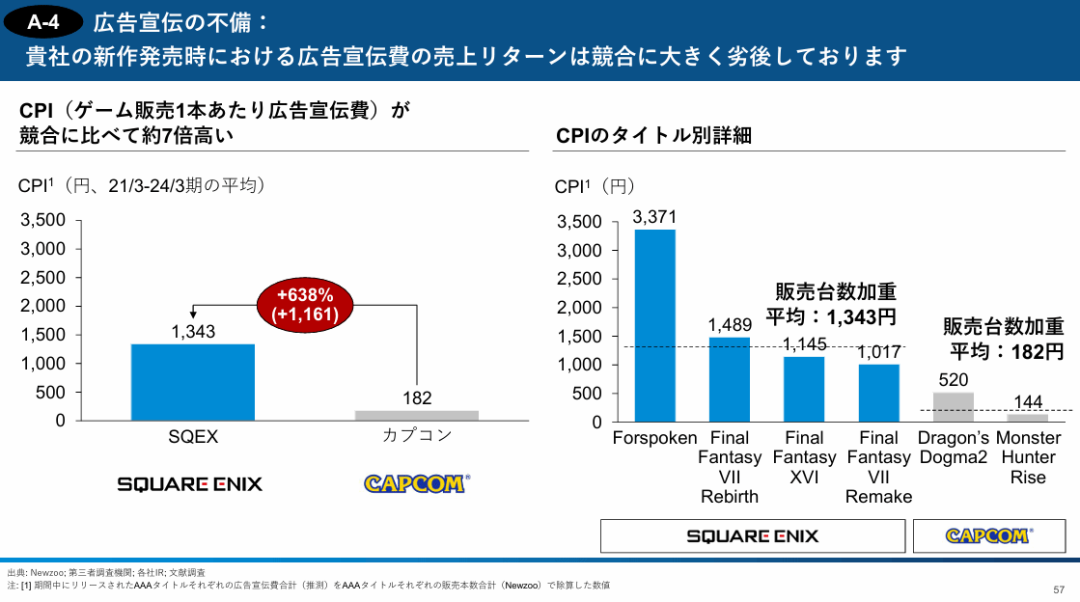 在报告中,3D基金主要提到,SE的开发成本存在严重的分配不合理且显著升高的问题。据3D基金的分析显示,SE旗下的新IP动作RPG《Forspoken》开发成本甚至要比《最终幻想16》这种当家旗舰作品还要高出近50%。另外,游戏的宣发费用也相当之高,平均每售出一份游戏所花费的宣传费比卡普空高出638%。