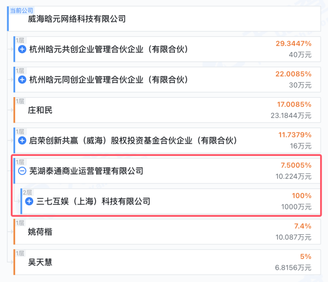 几乎在同一时段,三七互娱的另一笔投资也被悄然曝光。天眼查资料显示,三七互娱旗下公司芜湖泰通商业运营管理有限公司于近期入股了威海晗元网络,持股约7.5%。