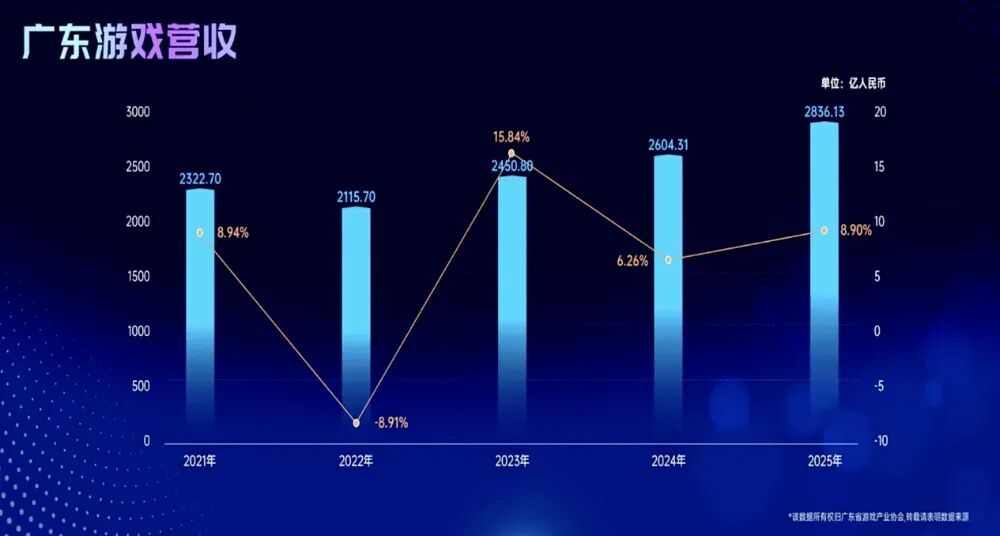 【2】《2025年广东游戏产业数据报告》显示,2025年广东省游戏产值为2836.13亿元,同比增长8.9%。其中手游收入达2116.32亿元,同比增长7.55%;端游营收696.55亿元,增幅达15.78%;小游戏营收规模飙升至370.46亿元,同比激增40.90%。出海游戏营收达464.27亿元,同比增长9.60%,整体发展稳健。