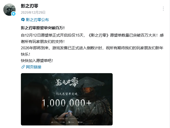 【2】12月29日,《影之刃零》官方在社交媒体宣布,自12月12日愿望单正式开启后15天,《影之刃零》愿望单数量已突破百万大关。