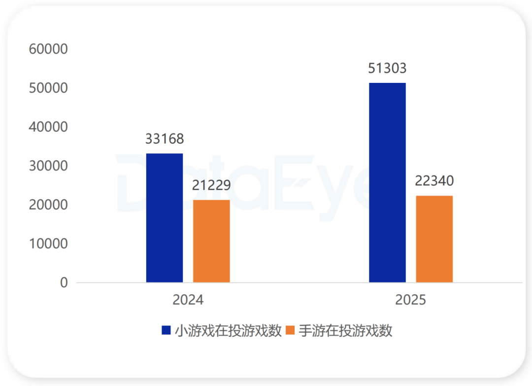2025年小游戏在投游戏数约5.1万款,同比激增54%,与手游APP赛道5.2%的缓慢增长(约2.2万款)形成鲜明对比。低开发成本、无需下载的便利性,叠加平台流量扶持,使小游戏成为广大开发者,尤其是中小团队的新兴主场。