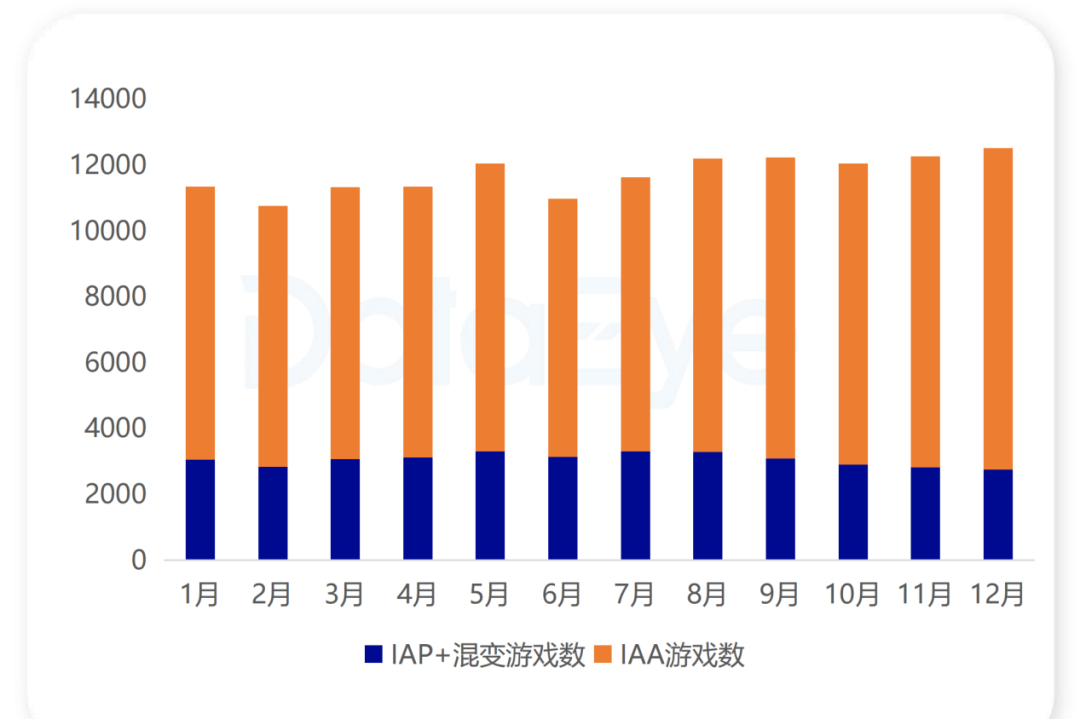 IAP+混变游戏数全年微降10.27%,5月达峰值3304款后逐步调整,年末保持在2700-2900区间。IAP+混变占比则从27.06%降至22.00%,中重度长线精品化产品站稳市场,劣质产品逐渐掉队。