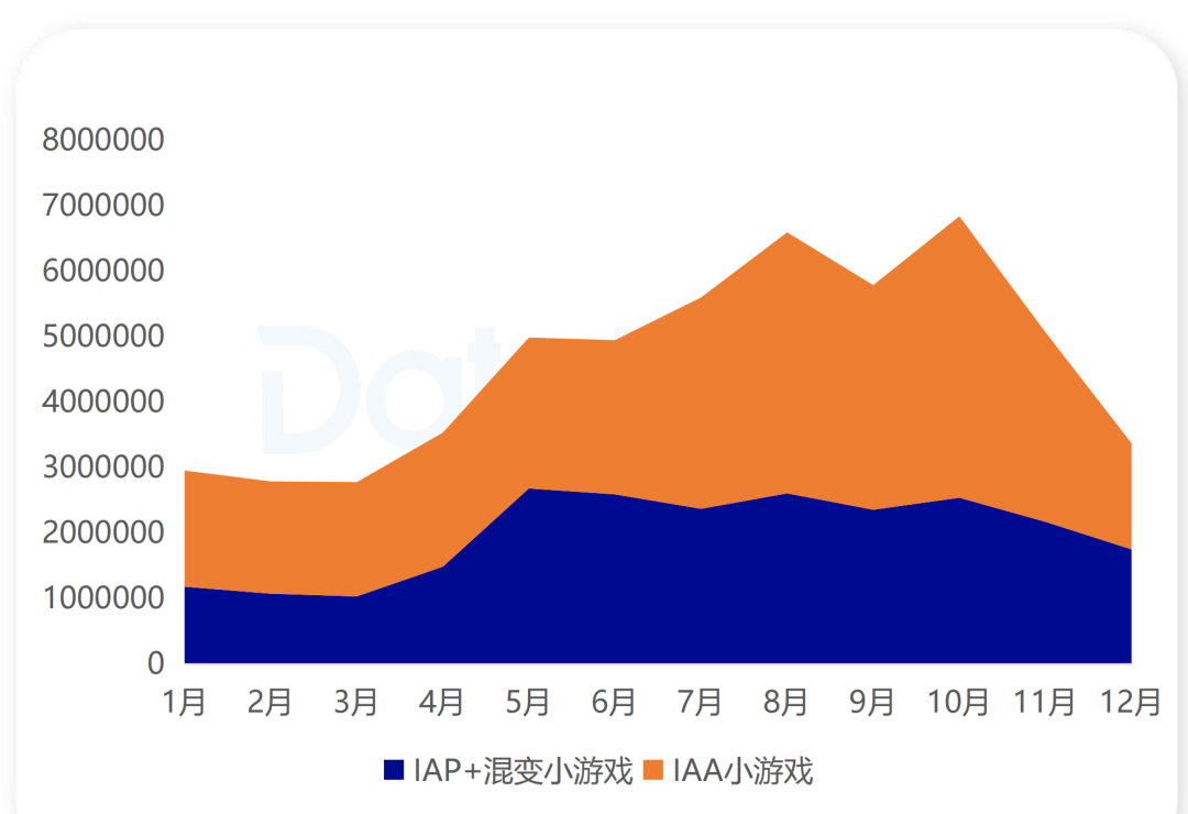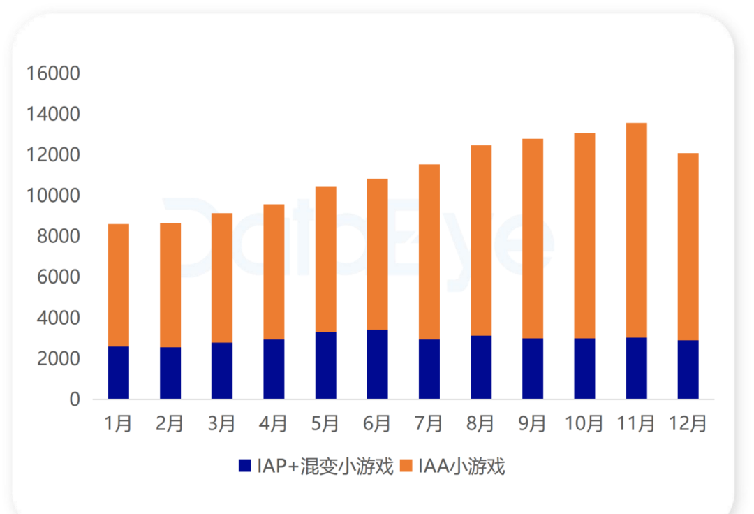 细分至月度,微信小游戏月度投放游戏总数从1月的11334款增长至12月的12511款,全年增长10%。其中,IAA游戏数全年增长18.05%,Q4每月连续突破9000款,成为增长核心引擎。