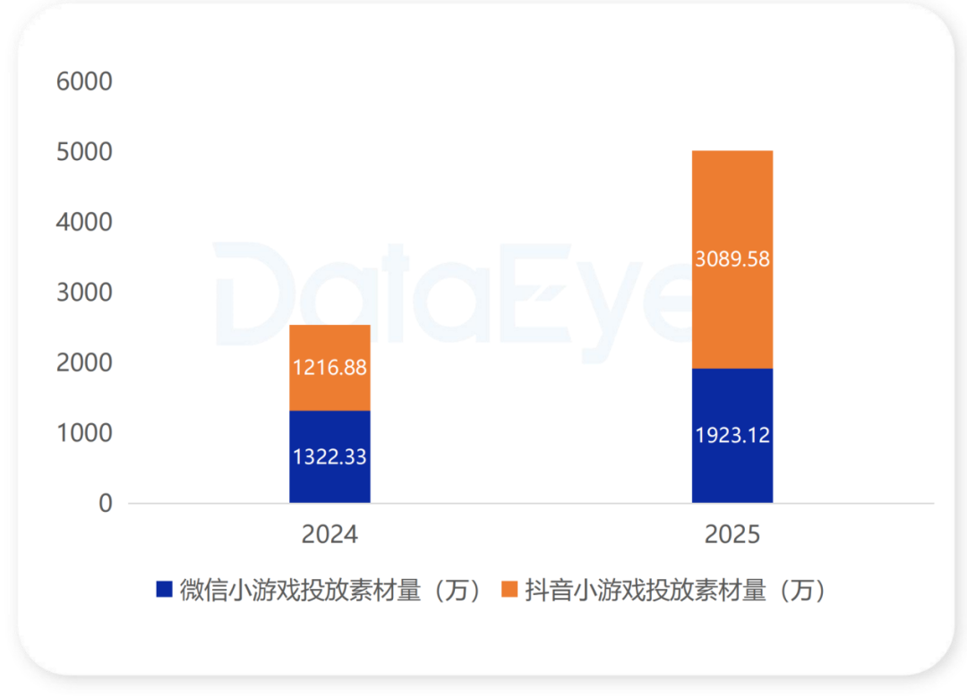 在行业快速发展的背景下,微信小游戏和抖音小游戏在投放素材总量均呈现高速增长。前者同比增长45%;后者总投放素材量超过3000万,同比增长153.9%,远超行业平均增速。