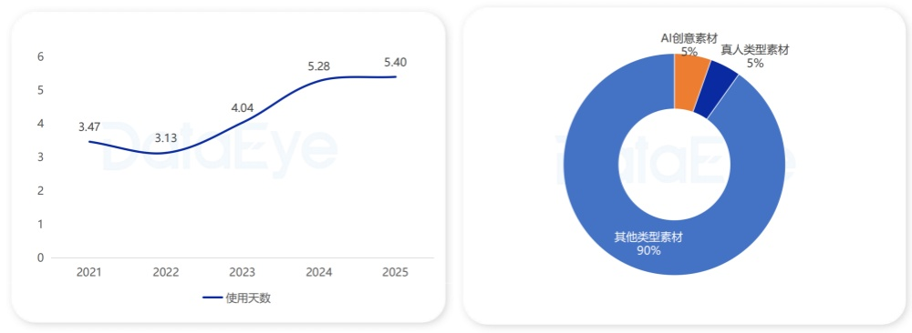 在素材投放使用效率上,微信小游戏在2025年投放素材平均使用天数小幅提升至5.4天。在投放素材上,真人类素材占比约5%。需要注意的是,AI生成素材占比已逼近真人素材。
