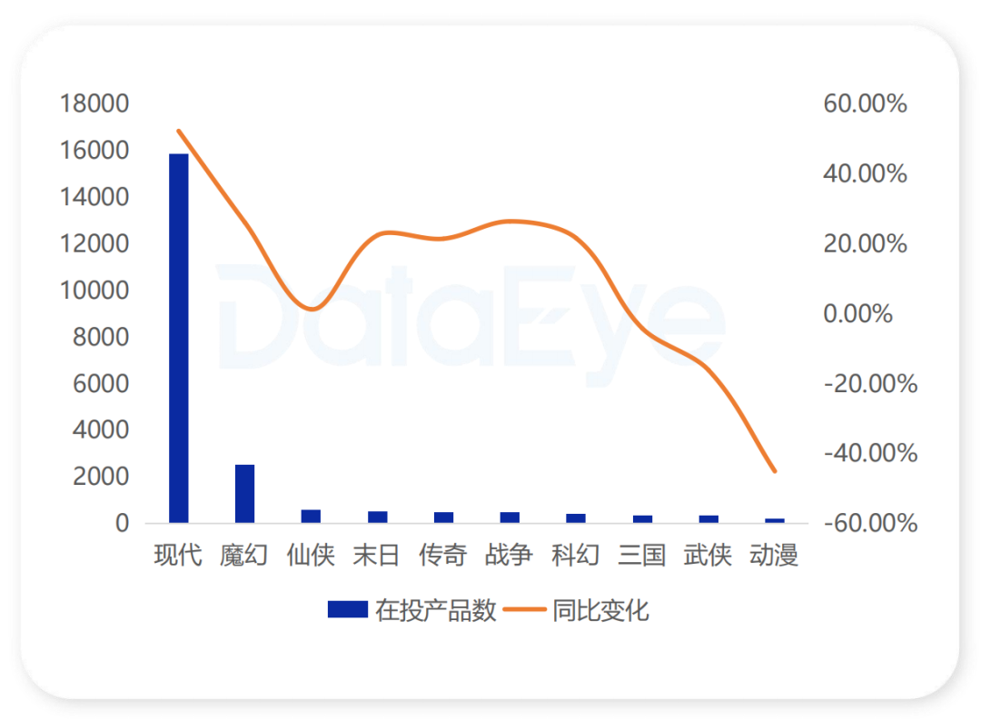 内容层面的变革同样剧烈。题材格局中,现代题材异军突起,在投产品数暴涨52.23%,成为绝对主流;魔幻、末日、战争、科幻等中重度题材随SLG、MMO品类的兴起保持20%以上增长。传统IP题材则因过度开发陷入同质化困局。