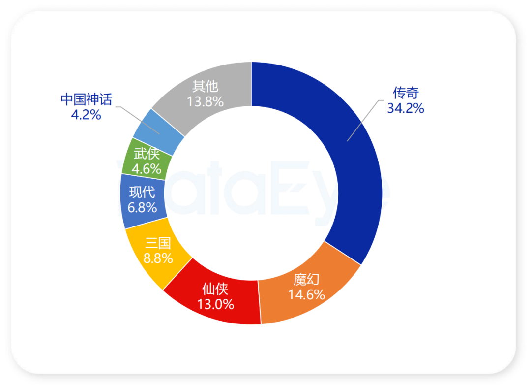 一个有趣的反差是,尽管现代题材产品数量占优,但买量素材榜仍由传奇、魔幻、仙侠等传统中重度题材主导。其中,传奇题材以171款占据投放素材榜TOP500近三分之一(34.2%),与魔幻、仙侠、三国合计占据TOP500榜单超70%的份额,反映出高付费潜力品类在买量投入上的坚决。