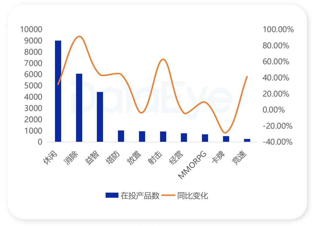 玩法赛道则上演着冰与火之歌。消除类产品以91.34%的同比增幅和超6000款的在投数量成为增长冠军,其“中度化”演变通过强化关卡设计与反馈机制,有效延长了用户生命周期。相反,卡牌玩法因模式固化与买量成本高企而大幅收缩。