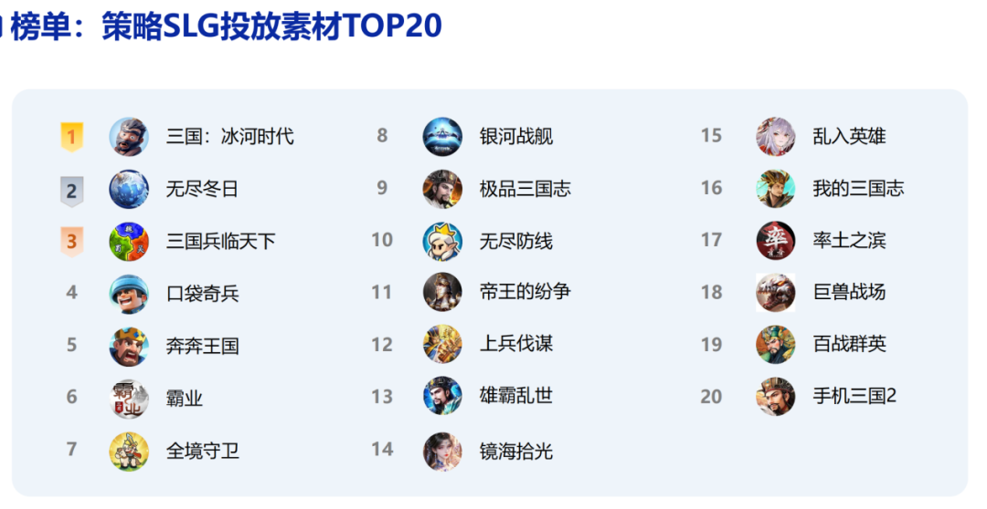 不同细分赛道在2025年呈现出截然不同的生存逻辑。策略SLG赛道热度攀升,在投产品数增长38.8%,买量素材于暑期档达到峰值。“轻量化操作+重度策略”的组合深受青睐,头部厂商如B站(《三谋》)、三七互娱(《霸业》)等加速入局。