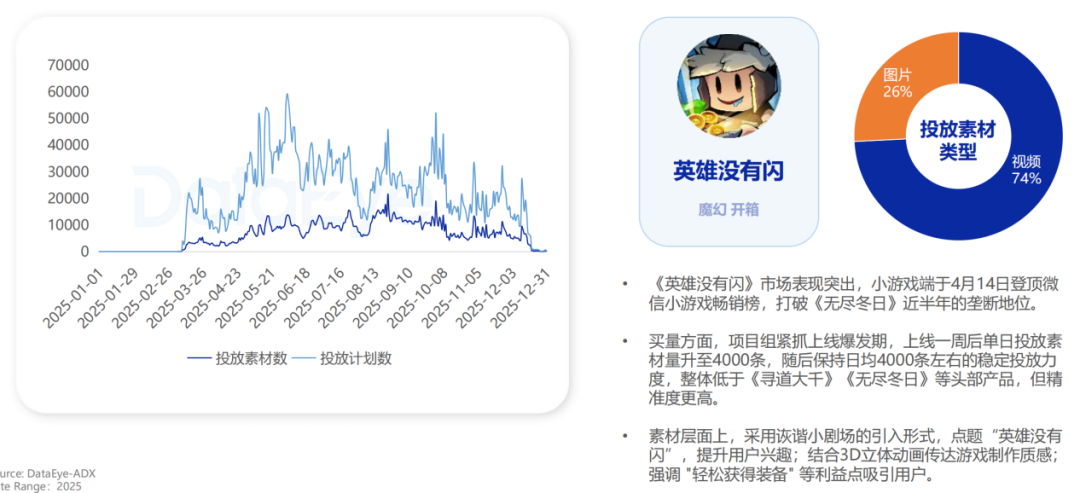放置开箱与传奇RPG赛道则生动演绎了“存量博弈”的涵义。两者素材量波动幅度分别高达80%与140%,而在投产品数保持相对稳定。这揭示出头部格局固化后,竞争焦点已非单纯铺量,而是转向玩法微创新、合规化调整与破圈尝试的效率比拼。