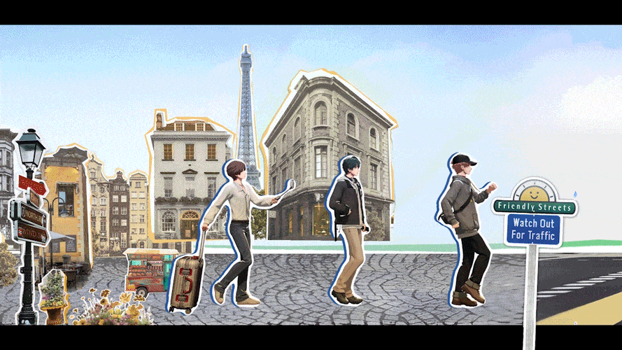 作为 PV 中最早亮相的角色,周拾乐(OCT)背着吉他、以明朗的笑容出现在便利店前,率先在群聊中发送「出发」号召大家踏上旅途。