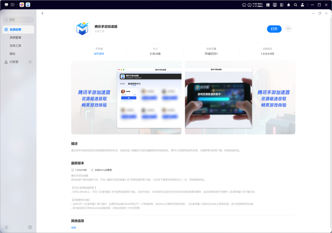 在绿联UGOS Pro系统中,部署这个功能只需要简单的几步。首先是在PC端,直接在应用中心下载安装“腾讯手游加速器”,打开应用并启用“极速获取游戏资源”,然后进入游戏就能完成匹配;