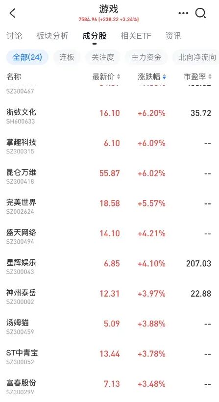 随后,有业内人士辟谣称,游戏公司并未收到税率调整的消息。而游戏板块也于盘中集体反弹,至A股收盘时,游戏板块上涨3.24%。