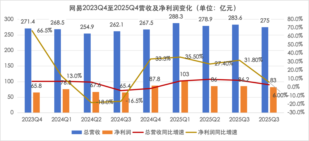 【1】2月21日,网易发布了2025年第四季度及全年财报。财报显示,2025年网易总营收达1126亿元,同比增长3%;营业利润为358亿元,同比增长21%。其中第四季度单季营收275亿元,营业利润同比增长6%至83亿元。