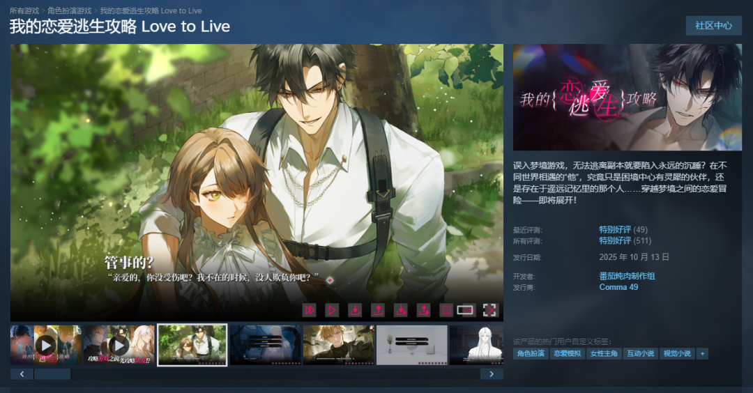 再比如,番茄炖肉制作组开发的梦境逃生题材乙游《我的恋爱逃生攻略Love to Live》,凭借超级能打的美术品质获得超600评论,目测销量也有小几万份。