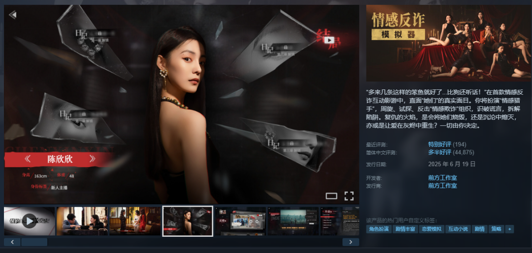 而题材和玩法的持续扩容,也助推真人影游市场规模水涨船高。根据《2025年国产买断制游戏年榜》统计数据,去年Steam平台国产影游总销售额超过2亿,2款作品销量超百万,另有4款影游销量超10万,销售额超140万的作品达15款之多。