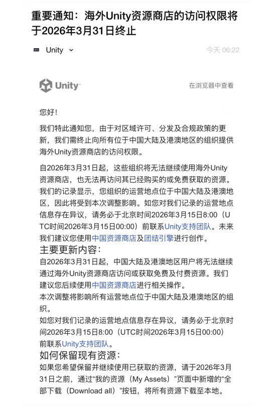 今天(3月3日),全球知名游戏引擎开发商Unity通过官方邮件通知,因区域许可、分发及合规政策更新,自2026年3月31日起,中国大陆及港澳地区用户将无法继续使用海外 Unity资源商店,同时无法访问免费资源或已购资源。