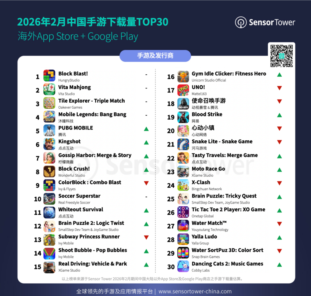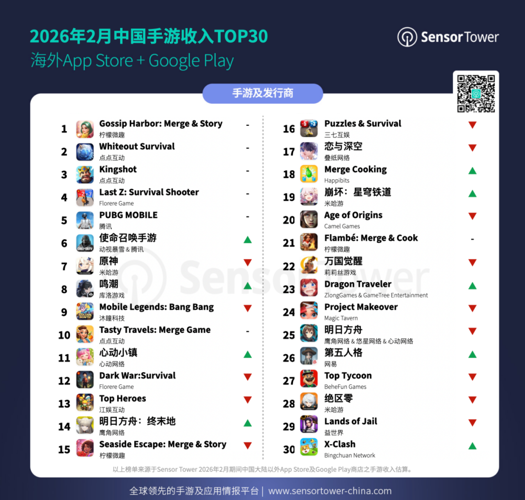 3月9日,Sensor Tower发布2026年2月中国手游产品在海外市场收入及下载量排行榜。(注:该榜单仅统计应⽤商店IAP预估值,不包括⼴告变现收⼊和中国地区第三方安卓渠道收入。)