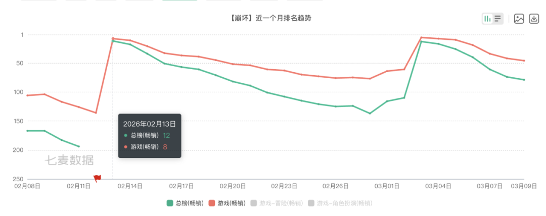 米哈游《崩坏:星穹铁道》 凭借2月13日推出的4.0版本“满月是神不在的时间”及新角色“爻光”等内容,实现海外收入环比激增近200%,强势位列收入增长榜第4名。高规格的版本更新依然是驱动其收入波动的核心引擎。