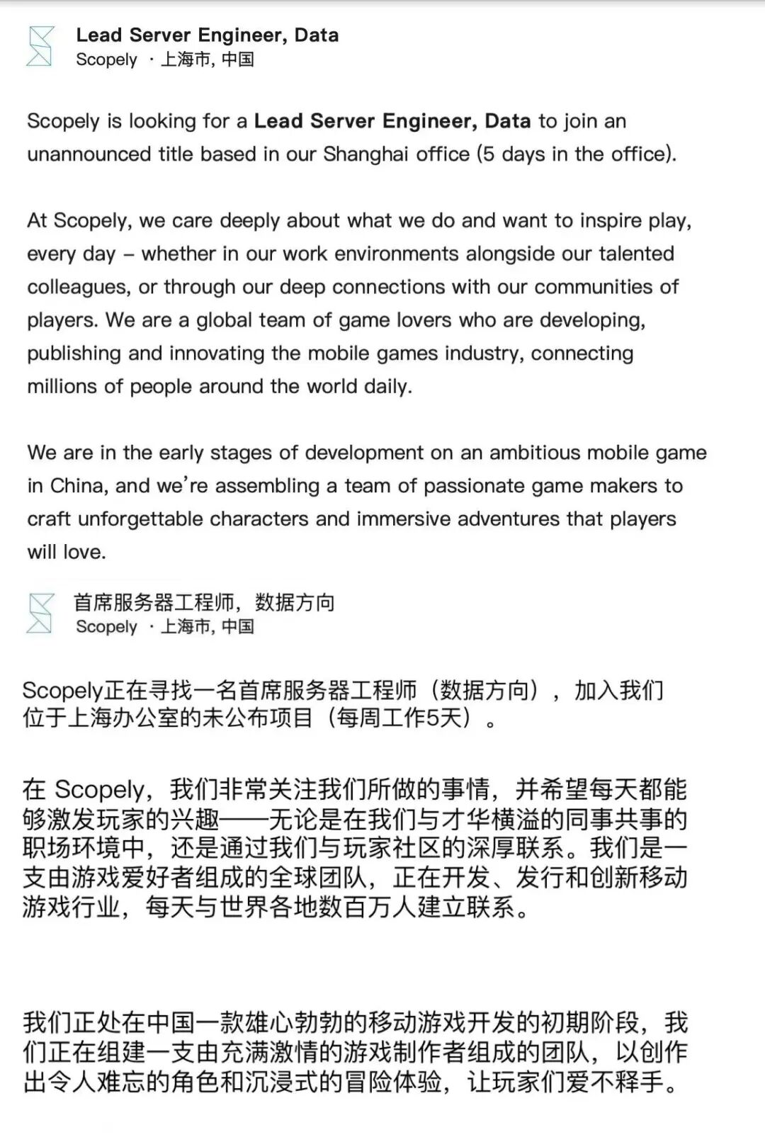 这一点也可从领英上的招聘信息得到印证。目前,Scopely上海工作室正在招募工程师,为尚未公开的项目持续投入。