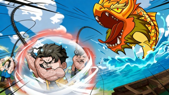 另外,游戏中还引入了QTE(快速反映事件)和高频点击机制。比如遇到巨大的鱼boss时,玩家需要根据战况快速切换不同的奇葩技能。