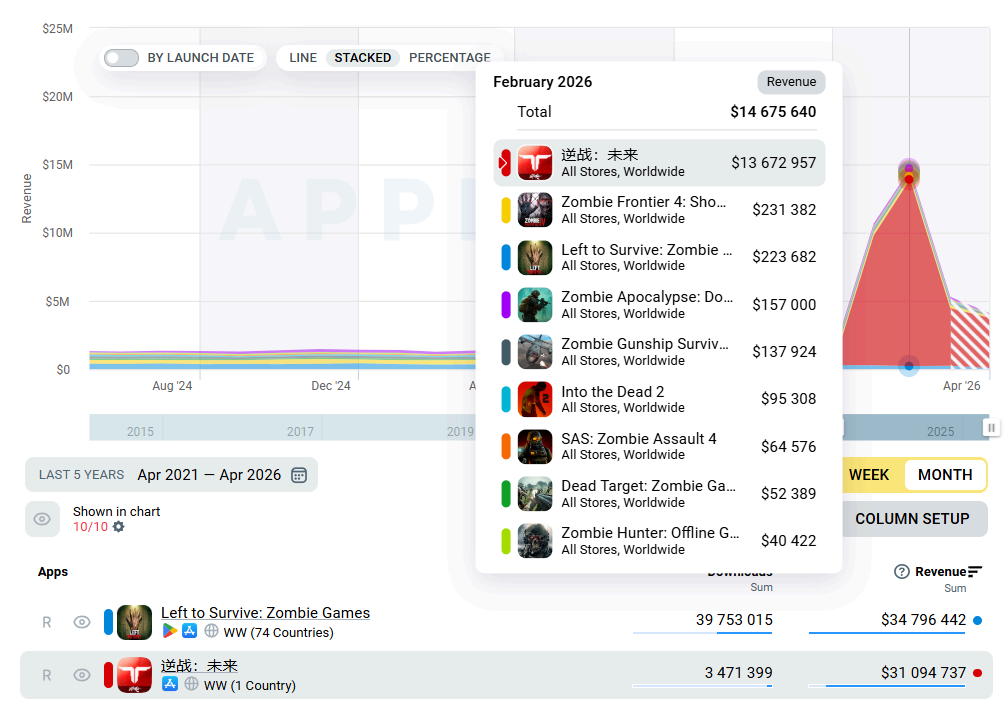 据报告显示,2026年开年后,射击与恐怖两大垂直赛道正迎来爆发式的收入增长,尤其是国产厂商在海外及国区的强势表现,再次拉高了其各自品类的天花板。