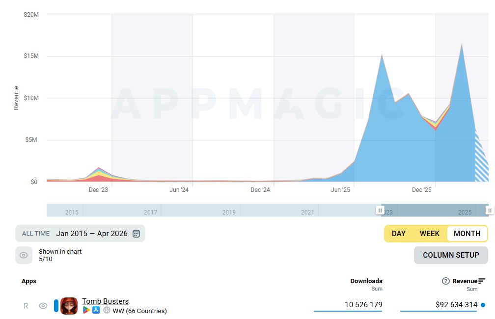 过去 12 个月,该品类全球移动端收入同比暴涨 13 倍,总收入一举跨过 1 亿美元大关。而在这一波增长盛宴中,深藏功与名的头号功臣,正是来自巨人网络在海外发布的黑马之作——《超自然行动组》(Tomb Busters)。