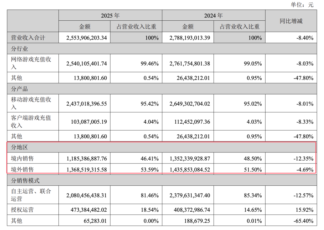 值得关注的是,冰川网络的境外收入已经超过境内。2025年,该公司境外销售收入13.69亿元,占总营收的53.59%,同比增长虽只有4.69%,但占比提升明显。