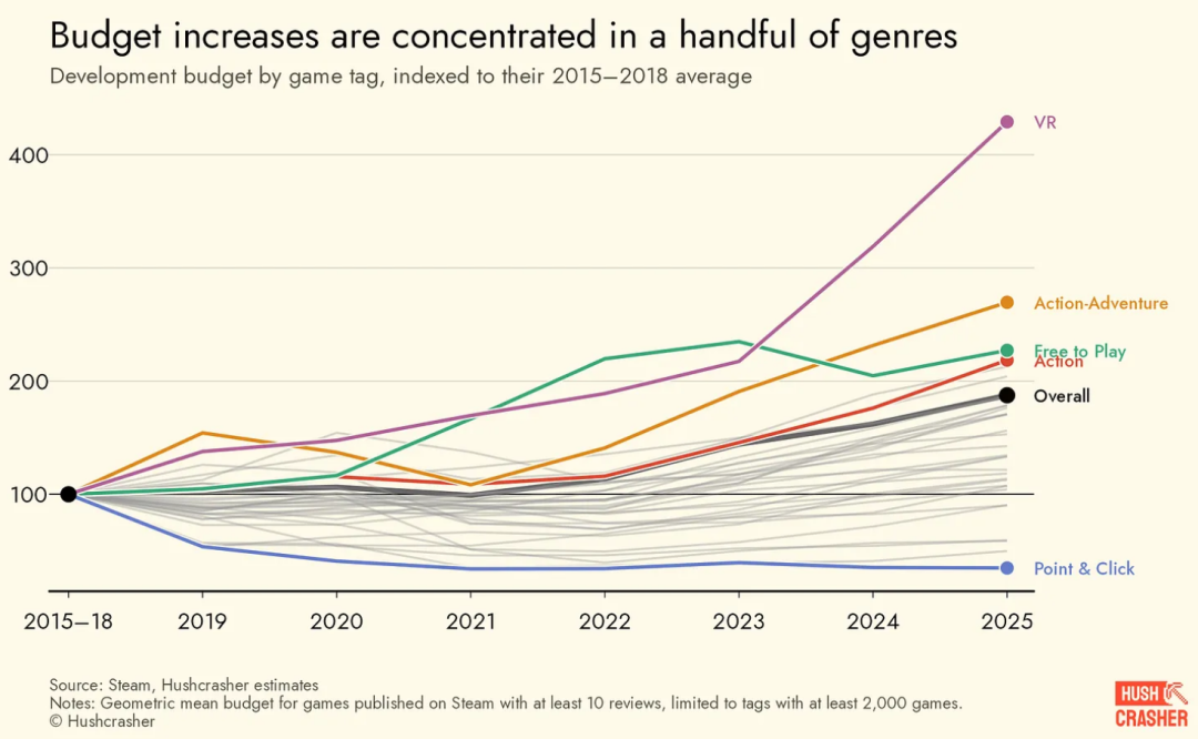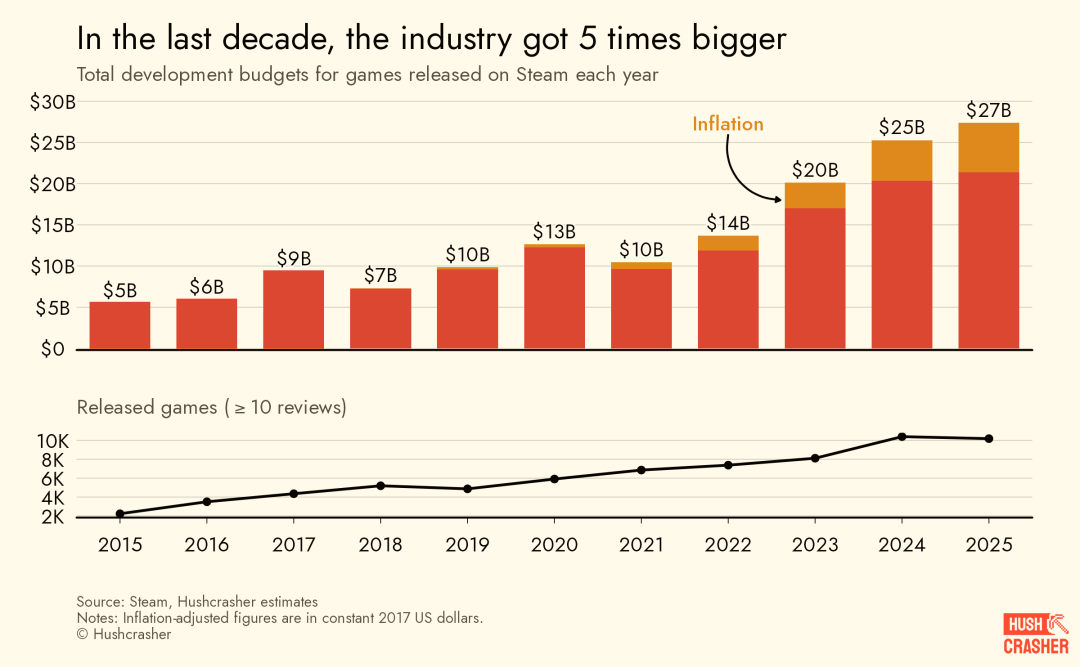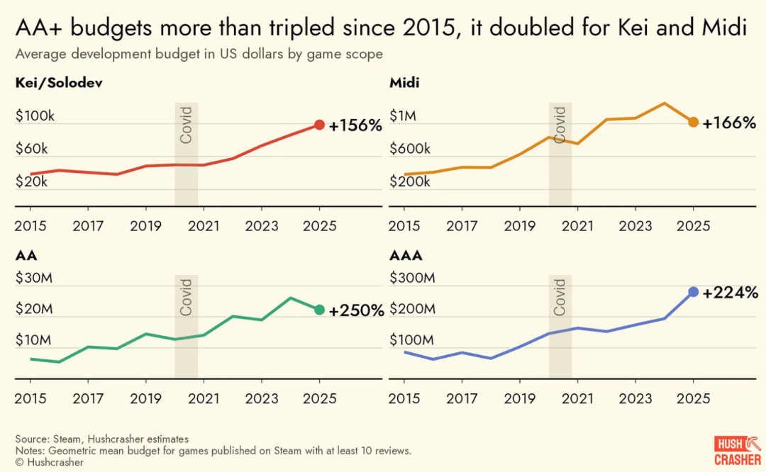 根据HushCrasher的分析,这种激增很大程度上归因于游戏发布数量的增加,同时全球通胀也对预算产生了直接影响。