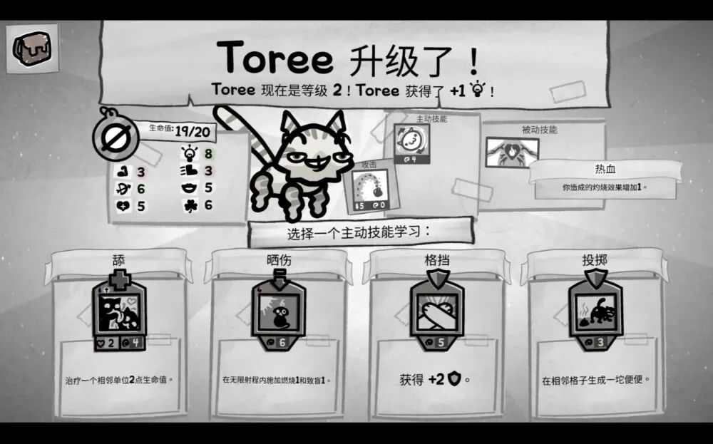 游戏的深度很大程度上来自于技能池,猫咪升级时学到的新魔法往往能让战术发生质变。比如一只猫拥有放火球的技能,那么在升级时就可以选择和灼烧相关的技能升级。