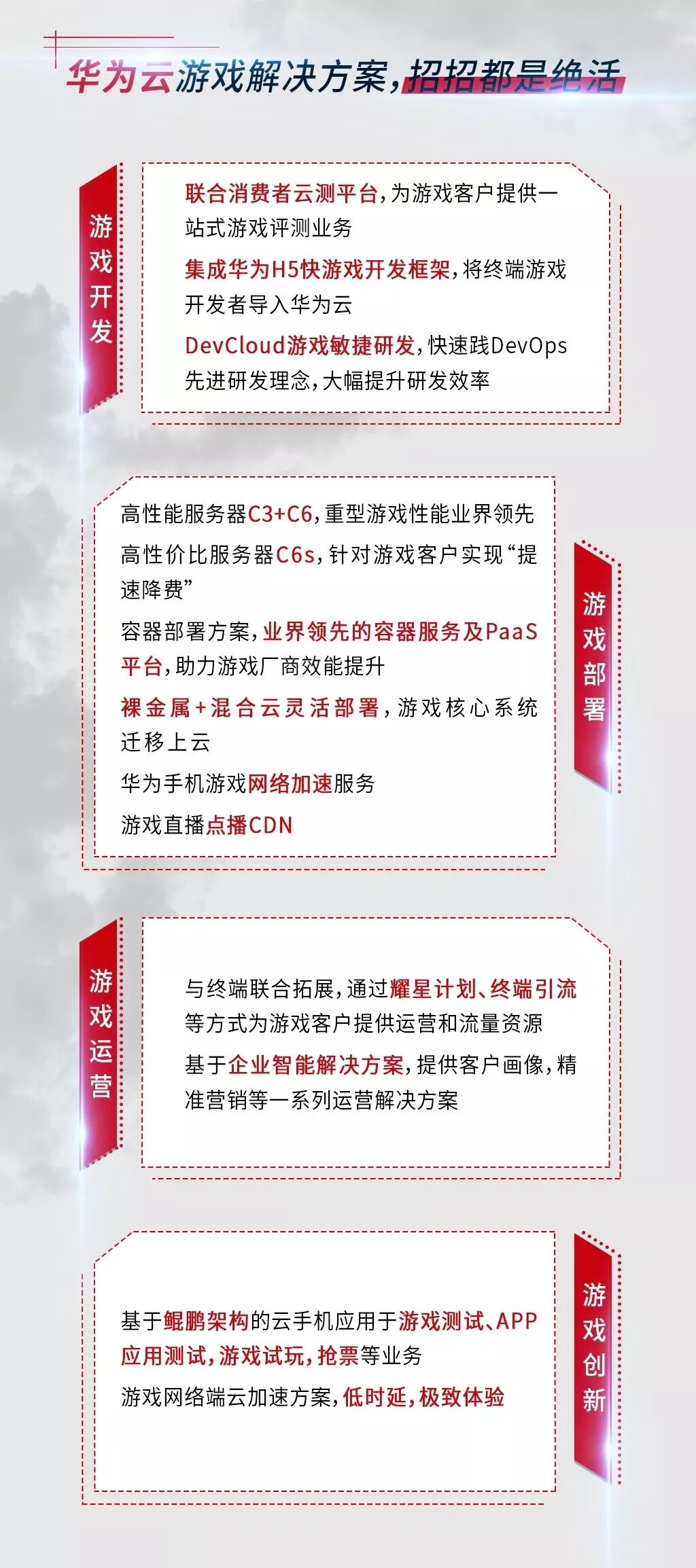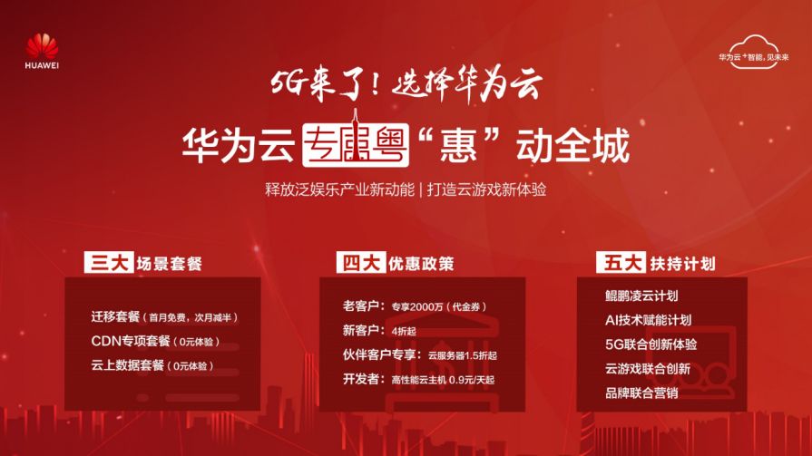 五大扶持计划:AI技术赋能计划、5G联合创新体验、鲲鹏凌云计划、云游戏联合创新、品牌联合营销。