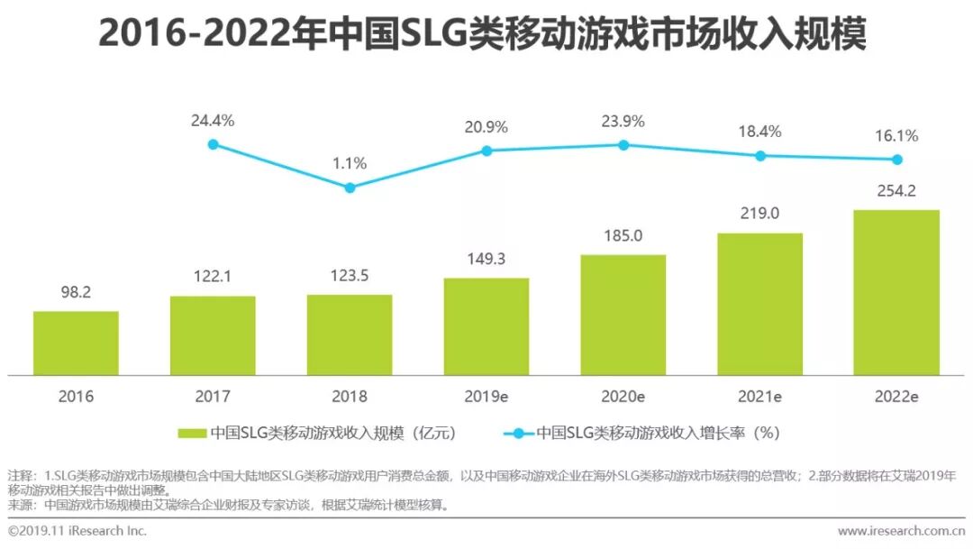 报告显示,2019年,中国SLG类移动游戏预计收入149.3亿元,增长率为20.9%,较2018年有大幅提升。到2022年,预计SLG类手游收入将达到254.2亿元,增速降至16.1%。