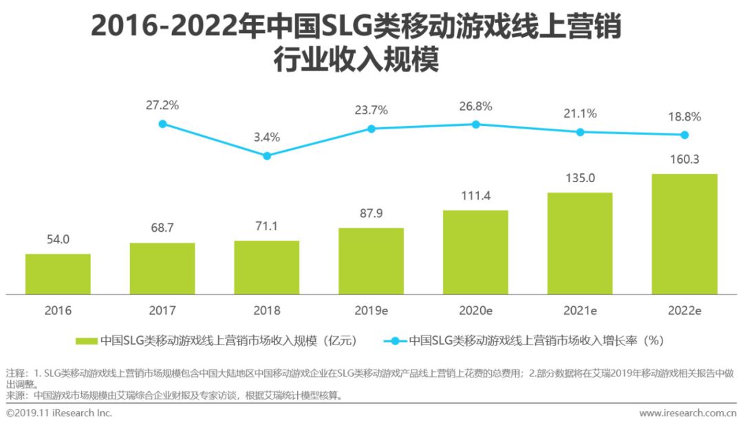 数据显示,2019年,中国SLG类移动游戏线上营销行业收入规模预计为87.9亿元,增幅达23.7%;2020年线上营销收入规模预计将涨一倍,达到160.3亿元。