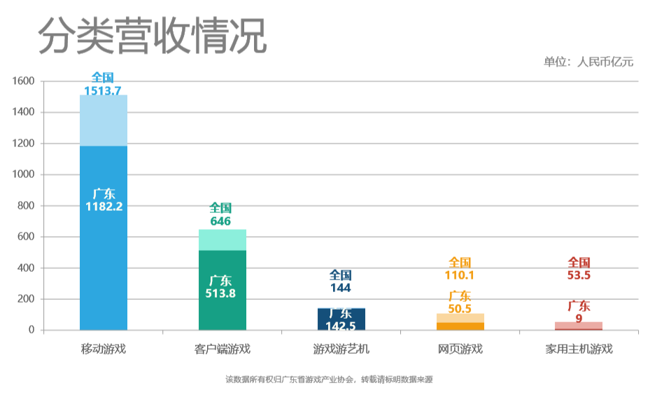 从分类营收情况来看,广东省在移动游戏、客户端游戏、游戏游艺机领域收入均领先于全国。
