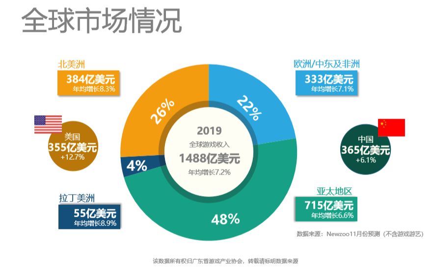 从总体情况来看,2019年全球游戏市场收入达到1488亿美元,中国游戏市场总规模达365亿美元,同比增长6.1%,为全球较大的游戏市场,美国次之。