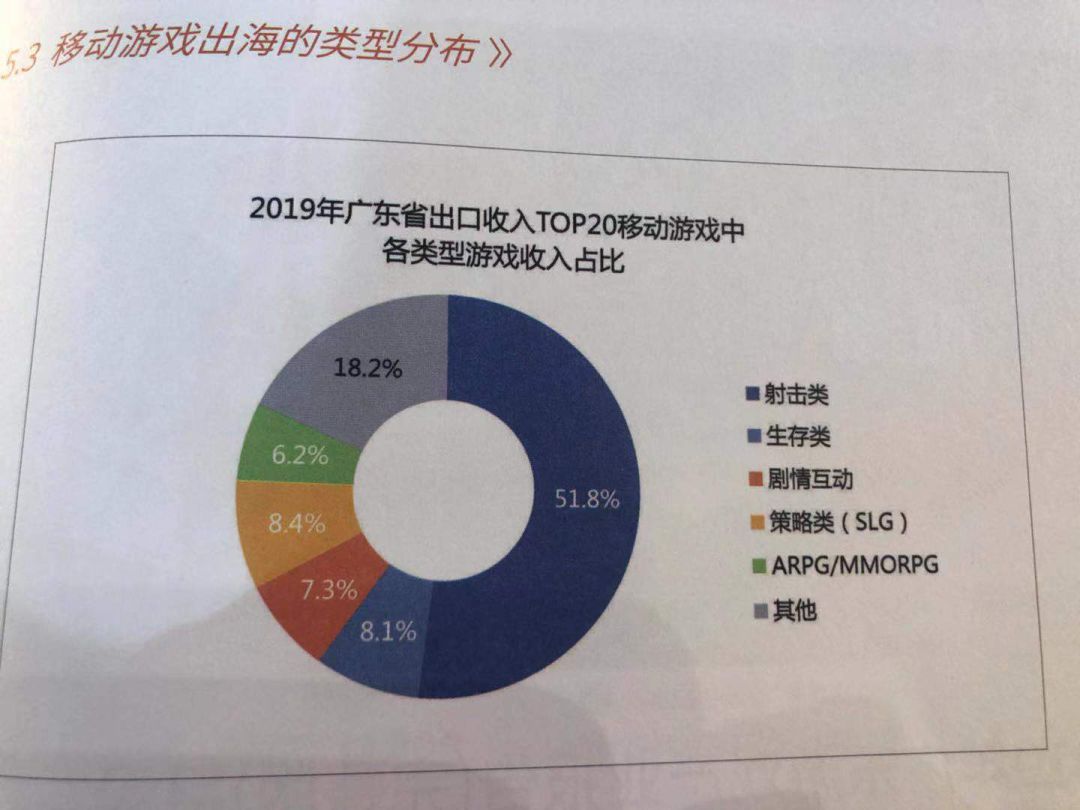 从出海品类上来看,根据统计,在广东出口收入TOP20的移动游戏中,射击类游戏收入占比很高,达51.8%;而SLG、生存类均超8%;互动剧情类占比7.3%,而ARPG/MMORPG占比仅为6.2%。