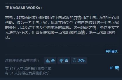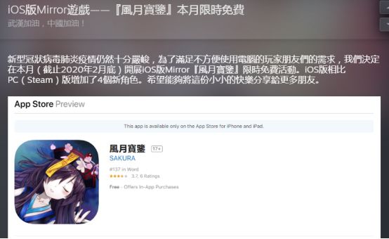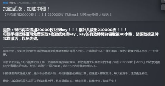 最让人意外的莫过于厂商Kagami Works,这位知名的“绅士游戏”开发商反应迅速,第一时间在steam平台面向国区玩家免费发放了累计21万枚的《魔镜(Mirror)》激活码。《魔镜》是一款以“美少女+宝石消除+GALGAME”要素为卖点的游戏,在steam上拥有98%的好评率。在Kagami Works的支援下,相信有不少玩家都拥有了美少女的陪伴,排解了不少孤独和寂寞。除了《魔镜》,Kagami Works还对旗下手游《风月宝鉴》做了限时免费,为不方便使用电脑的玩家提供娱乐。这个玩家心目中的“黄油”厂商,在疫情面前却如此走心,实在是让人觉得既有趣又感动。