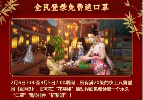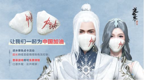 《剑侠情缘网络版3》和《逆水寒》这两款国内受众颇广的武侠MMORPG迅速跟进,在游戏中设计了“口罩”的外观装备,且玩家登录游戏后就可以领取。除了用这种形式为中国加油,表达“祈黎明”这样的情感为大家鼓劲之外。其实这也是一种不错的宣传手段,让其受众较广的玩家群体意识到出行戴口罩的重要性。