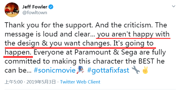 在全民讨伐下,该片导演Jeff Fowler被迫宣布重新制作索尼克形象。电影原本定于2019年11月上线也推迟到今年2月14日。