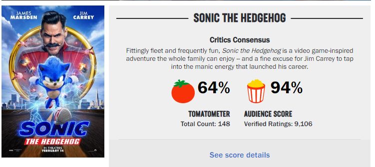 对于这样“知错能改”的行为,大众往往是喜闻乐见,也愿意买单。经过这次事件的热度,《刺猬索尼克》成功化危为机,最终改版后的索尼克获得了大众认可,烂番茄上当前该片影评人好评度为64%,观众好评度达到94%。