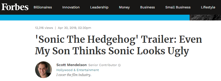 2019年4月,派拉蒙影业满心欢喜放出了影片首个预告片,不料引发全网对伪真实版的索尼克造型的吐槽。比如福布斯(Forbes)网站发表一篇名为“‘刺猬索尼克预告片’:就是我儿子都觉得索尼克很丑”的文章。
