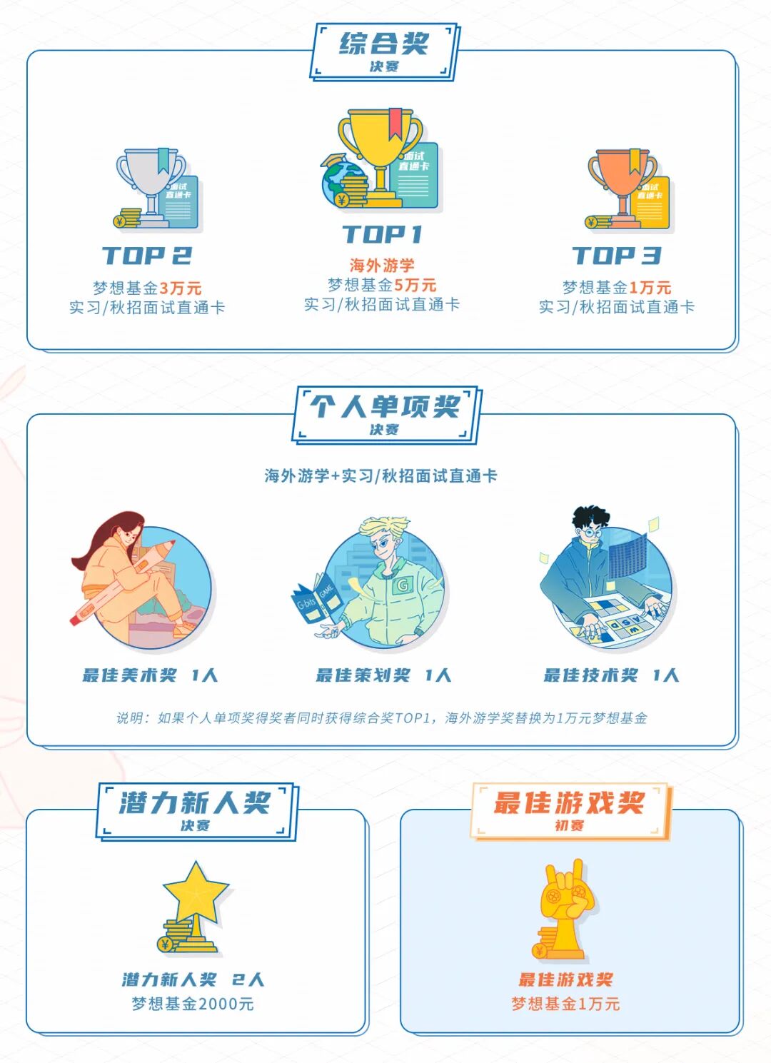 除了免费海外游学,本次大赛还设置了总金额高达10万元的梦想基金与种类丰富的奖项,鼓励同学们坚持初心,坚持自己的游戏梦想。此外,表现优异的参赛者还可获得实习/秋招面试直通卡,以及与资深游戏制作人面对面交流的机会等。