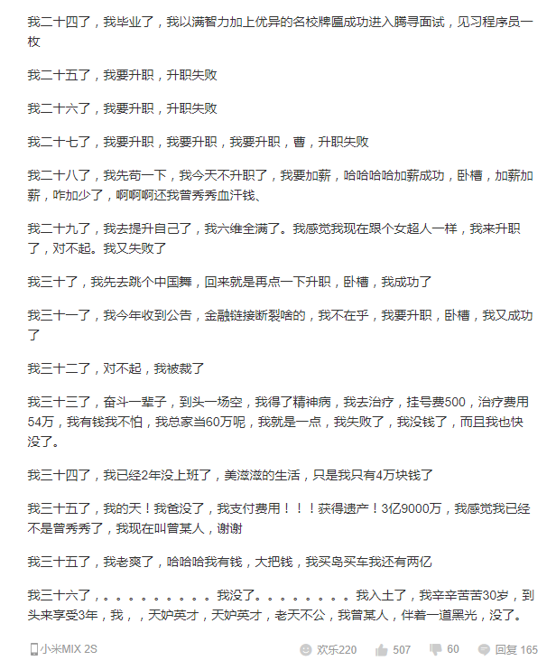 在笔者体验的第一次人生中,父母年龄相差29岁。在3岁时,得了感冒、肺炎,但没有选择去医院,全靠自愈,同时还思维清晰地回答了父母的问题;10岁时拿着父母给的零花钱去整形医院做了个除皱,自我感觉良好;浑浑噩噩地毕业,相亲列表中的女朋友永远比自己大20岁,家里经济情况在破产和股票大赚中循环;终于到39岁那年,我经历太多,之后便突然眼前一黑,撒手人寰。