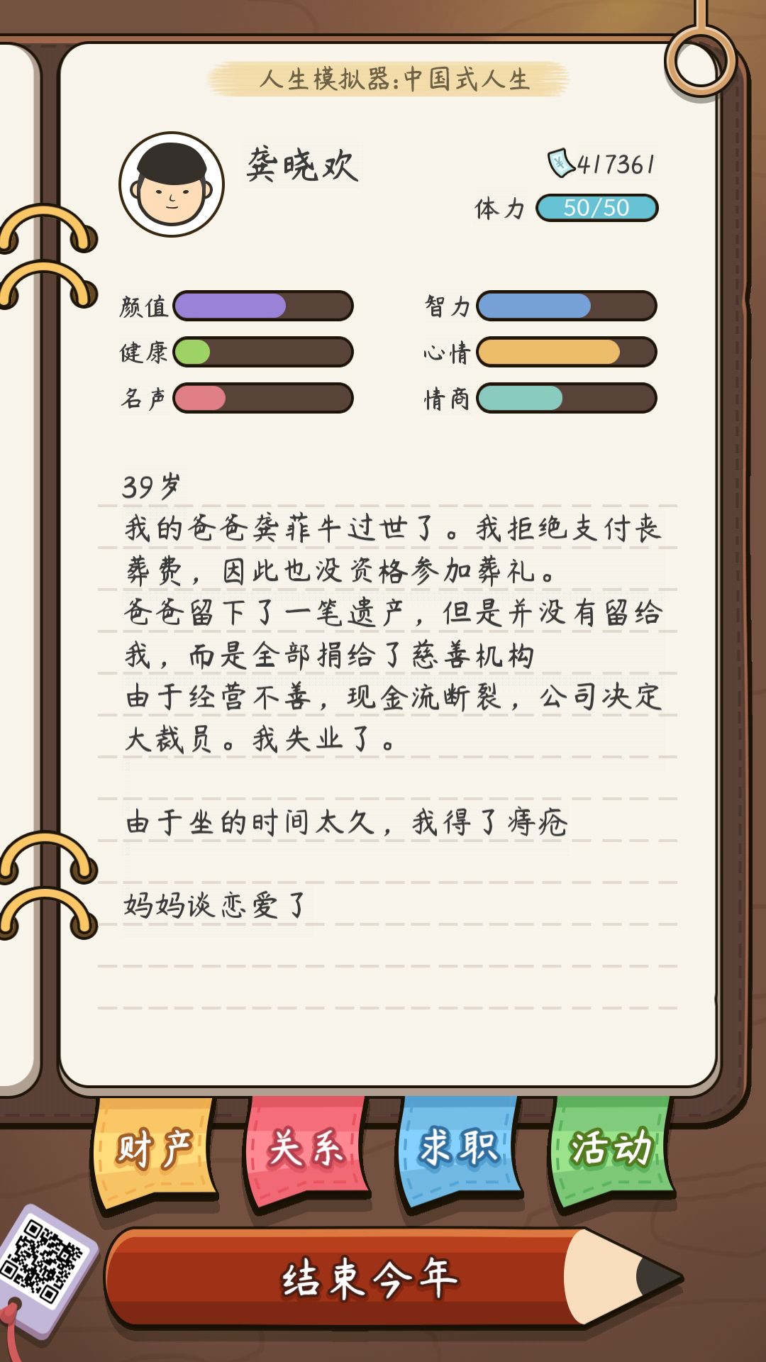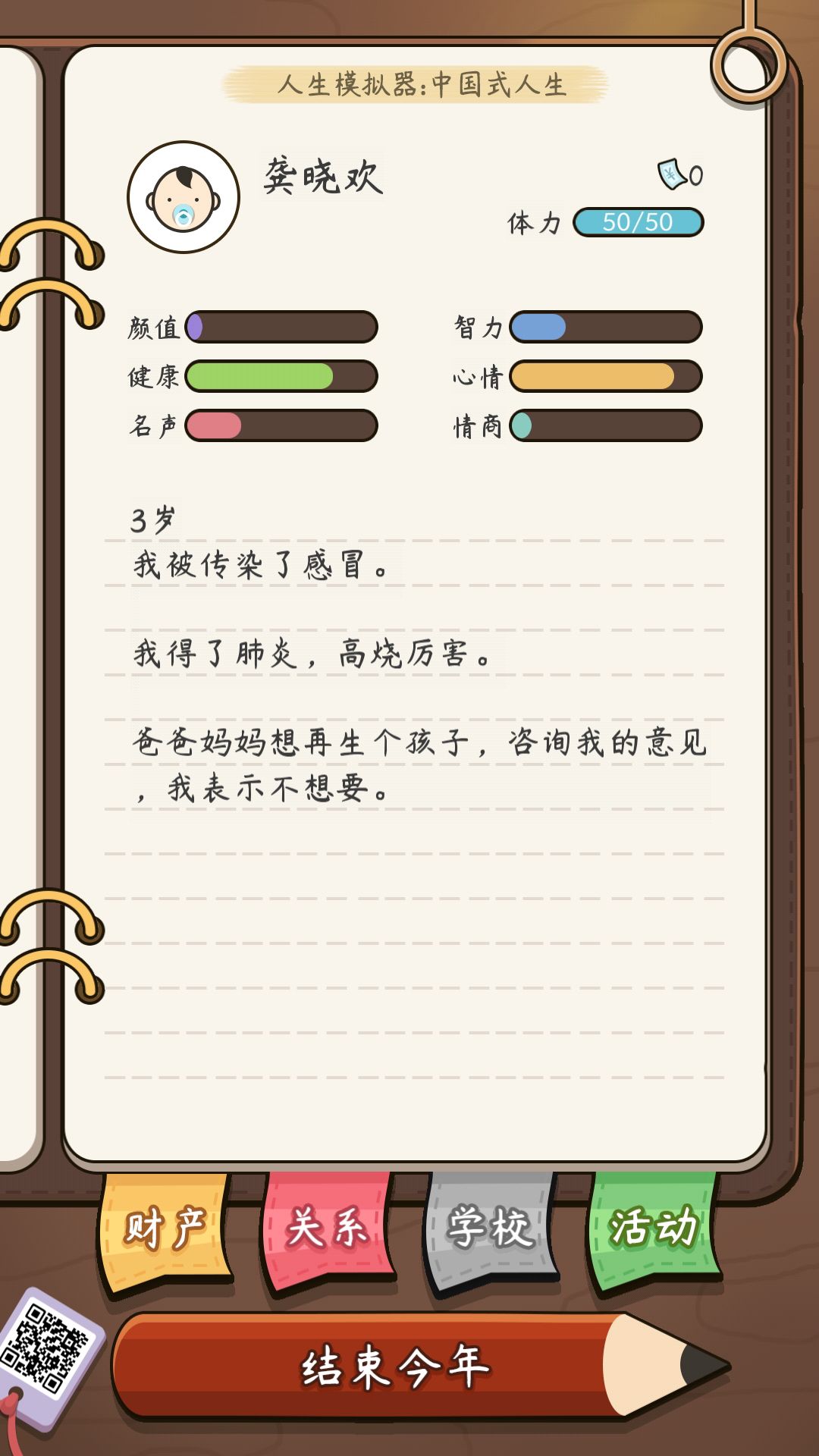 《人生模拟器:中国式人生》模拟的是主人公一生的成长过程,以岁为单位,玩家在每年可以进行财产、关系、学校和活动四个大项下的各个分类。既然是模拟游戏,符合现实逻辑显然是最重要一点,但《人生模拟器:中国式人生》似乎完美规避了这一点,创造出一种神奇的体验。